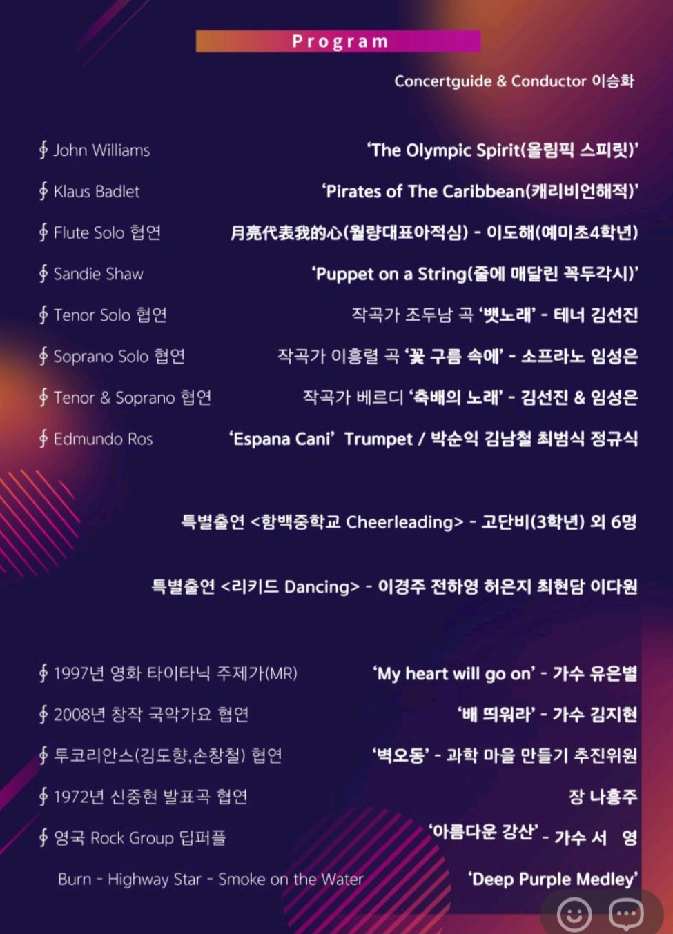 이번 공연에서는 올림픽 스피릿, 캐리비안의 해적 등 친숙한 명곡을 비롯해 플루트 협연, 테너·소프라노 성악 무대, 트럼펫 연주까지 다채로운 프로그램이 펼쳐지며 관객들에게 깊은 감동을 선사했습니다.